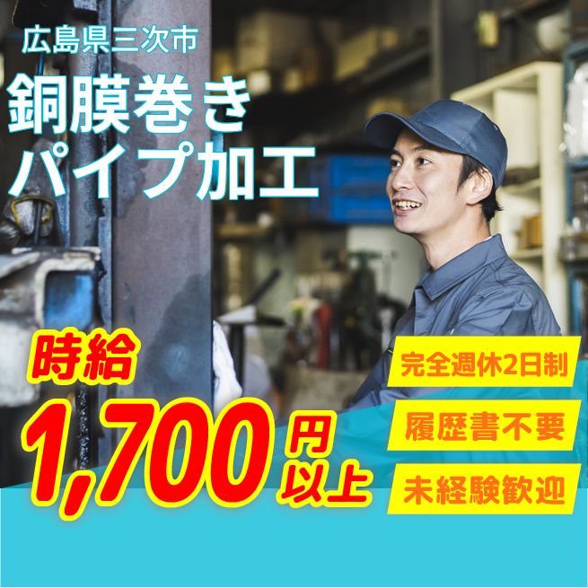 給与詳細 年収例 4,334,400円 月収例 361,200円 勤務地 広島県三次市 仕事内容 【業務内容】製造機械オペレーターとして、金属パイプの加工を担当します。