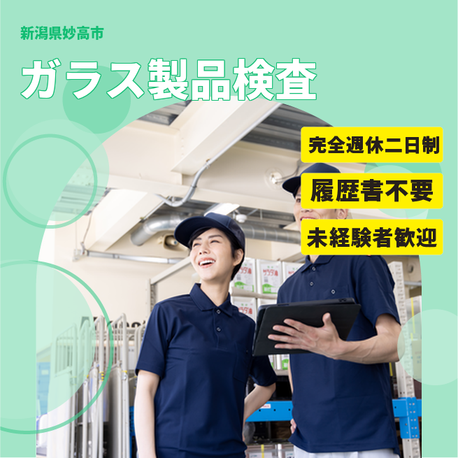 給与詳細 月収例 220,545円 時給例 1,131円 勤務地 新潟県妙高市 仕事内容 ■ガラス製品の検査業務