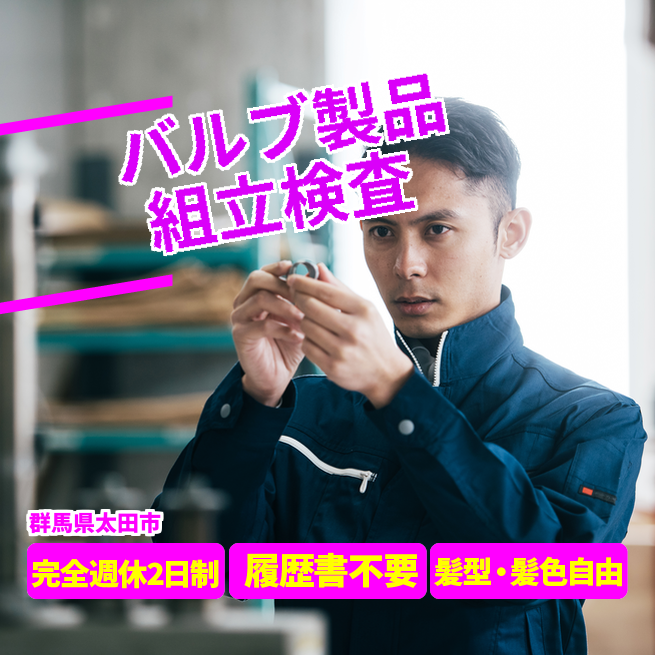 給与詳細 月収例 200,000円 日給例 10,000円 勤務地 群馬県太田市 仕事内容 【日勤務用】バルブ製品の組立・検査・梱包・業務