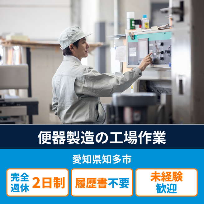給与詳細 月収例 292,500円 日給例 12,000円 勤務地 愛知県知多市 仕事内容 【業務内容】便器の製造に関わる一連の作業を担当します。