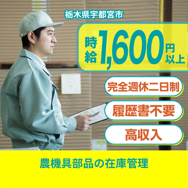 給与詳細 月収例 256,000円 時給例 1,600円 勤務地 栃木県宇都宮市 仕事内容 【業務内容詳細】農機具部品の在庫管理、納期管理、ロケーション管理。PC入力作業あり。フォークリフトの免許がある方は運搬作業あり。重量物:~15kg【取扱製品情報】トラクター、田植え機、コンバインなどの農機具