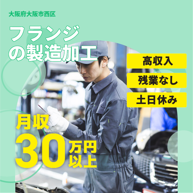 給与詳細 月収例 300,000円 時給例 1,875円 勤務地 大阪府大阪市西区 仕事内容 ウィルオブ・ワークの正社員として取引先のフランジ製造工場で勤務いただきます。