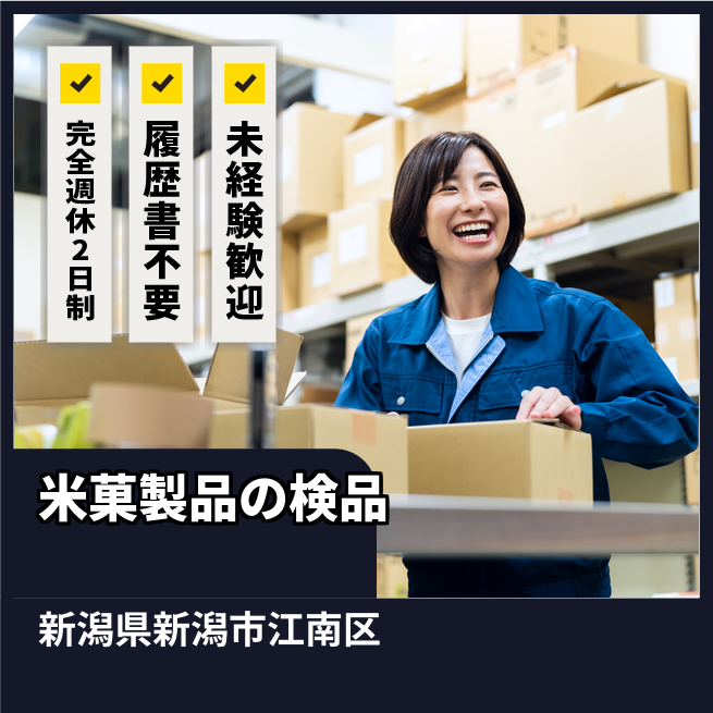 給与詳細 月収例 214,500円 時給例 1,100円 勤務地 新潟県新潟市江南区 仕事内容 【業務内容】米菓の製造補助作業