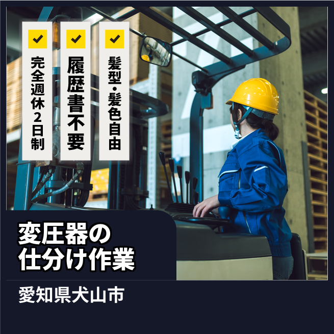給与詳細 月収例 270,200円 日給例 13,510円 勤務地 愛知県犬山市 仕事内容 【業務内容】電柱に設置された変圧器の移動と仕分けをフォークリフトで行う作業