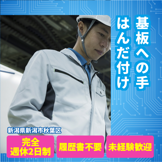 給与詳細 月収例 224,250円 時給例 1,150円 勤務地 新潟県新潟市秋葉区 仕事内容 【業務内容】手はんだ付けによるプリント基板の組み立て