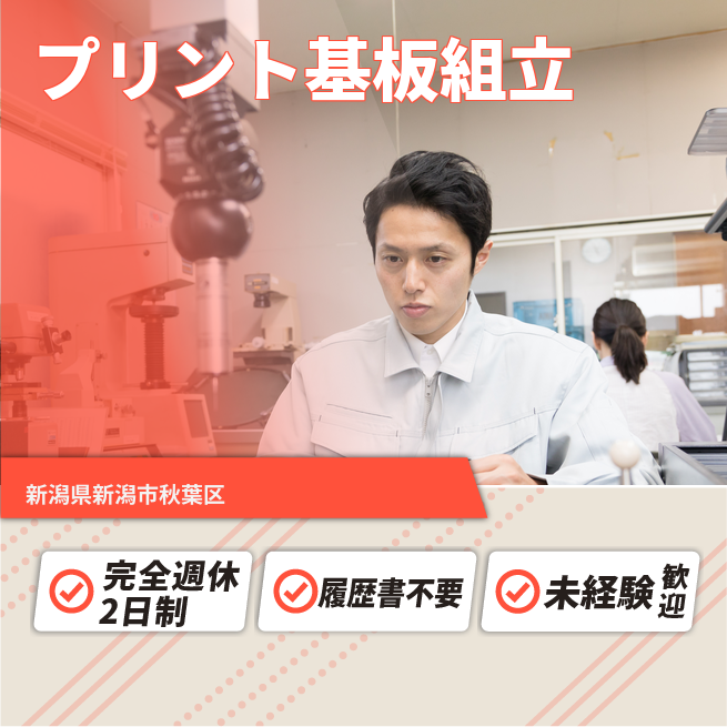 給与詳細 月収例 224,250円 時給例 1,150円 勤務地 新潟県新潟市秋葉区 仕事内容 【業務内容】プリント基板の手はんだ付け作業