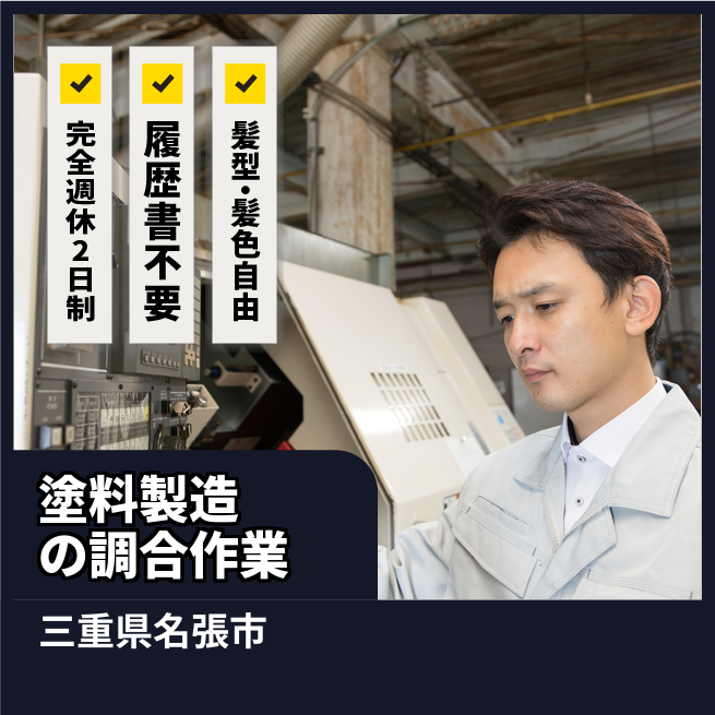給与詳細 月収例 253,500円 日給例 10,400円 勤務地 三重県名張市 仕事内容 ≪残業すくなめ!塗料製造のオシゴト≫