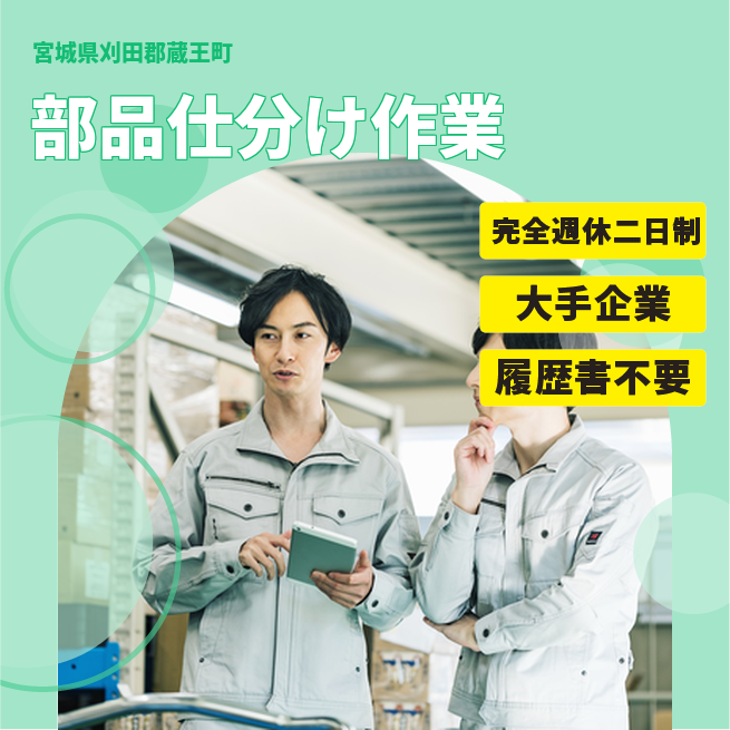 給与詳細 月収例 233,025円 時給例 1,195円 勤務地 宮城県刈田郡蔵王町 仕事内容 精密部品受入対応、PC入力、発注対応、部品のピッキング業務
