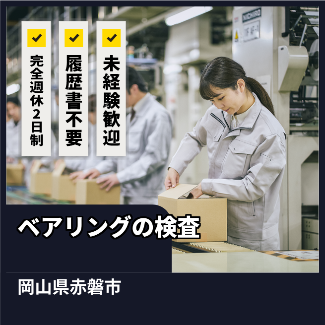 給与詳細 月収例 250,000円 日給例 12,500円 勤務地 岡山県赤磐市 仕事内容 自動車部品の検査業務