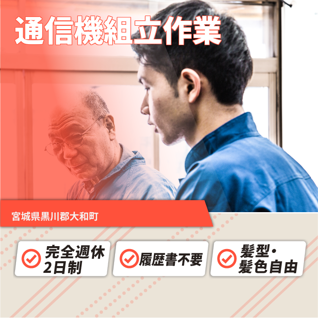 給与詳細 月収例 250,000円 日給例 12,500円 勤務地 宮城県黒川郡大和町 仕事内容 基盤の組立・検査作業