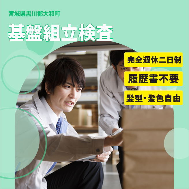 給与詳細 月収例 250,000円 日給例 12,500円 勤務地 宮城県黒川郡大和町 仕事内容 【業務内容】基盤の組立・検査作業