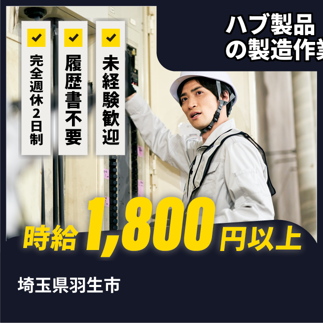 給与詳細 月収例 270,000円 時給例 1,800円 勤務地 埼玉県羽生市 仕事内容 ハブ製品の製造、研削、巡回、外観検査、梱包作業をお願いします。