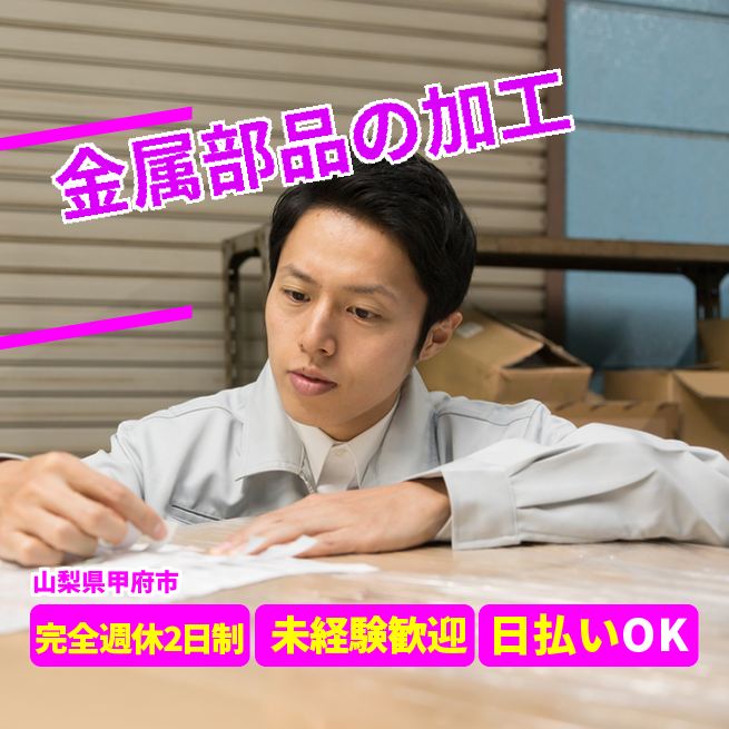 ※実際と異なるケースもございます。 交通費 支給あり 応募の流れ 本ページ内<応募する>ボタンより、必要項目をご入力の上、ご応募ください。 勤務地 【勤務地】山梨県甲府市大津町 勤務時間 【勤務地】①08:15~17:20 休憩60分