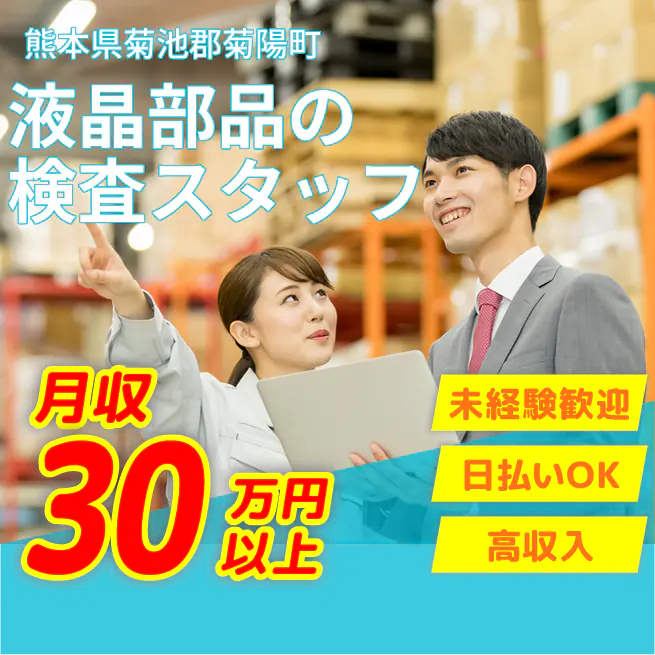 給与詳細 月収例 304,500円 日給例 11,200円 勤務地 熊本県菊池郡菊陽町 仕事内容 【業務内容】