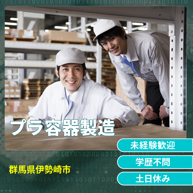 給与詳細 月収例 224,000円 日給例 11,200円 勤務地 群馬県伊勢崎市 仕事内容 化粧品や食品等に使用されるプラスチック容器の製造です。成型工程・印刷工程・仕上げ工程に分かれており、適正に合ったポジションに配属します。成型工程では原料袋(25kg)を1日に数回台車を使って運搬し、原料を計量しマシンに投入します。印刷工程では、製品への印刷状態の検査を行います。仕上げ工程では、製品の段ボール詰め作業を行います。各工程に配属後、作業に慣れてきたら複数台のマシンを担当します。