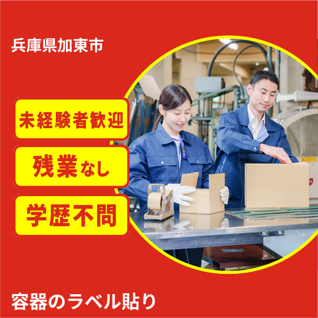 給与詳細 月収例 183,000円 時給例 1,143円 勤務地 兵庫県加東市 仕事内容 ラベル貼り検品梱包キャップ締め