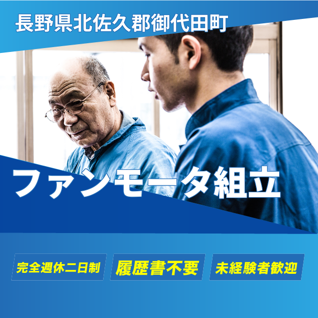 給与詳細 月収例 250,000円 日給例 12,500円 勤務地 長野県北佐久郡御代田町 仕事内容 【製品】ファンモーター