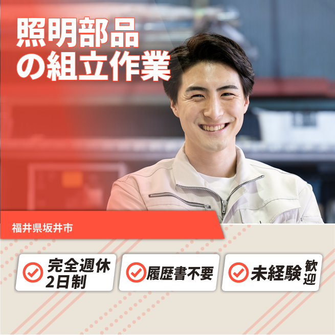 給与詳細 月収例 218,000円 日給例 10,900円 勤務地 福井県坂井市 仕事内容 【業務内容】LED照明器具の組立と部品管理を行う工場作業