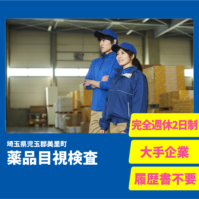 給与詳細 月収例 260,000円 日給例 13,000円 勤務地 埼玉県児玉郡美里町 仕事内容 ・シリンジ・バイアルなどを1本ずつ手で持ち、決められた手順で異物等を目視で検出
