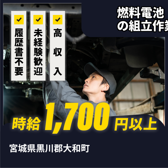 給与詳細 月収例 260,000円 時給例 1,700円 勤務地 宮城県黒川郡大和町 仕事内容 【業務内容】燃料電池ユニットの組付けと運搬作業