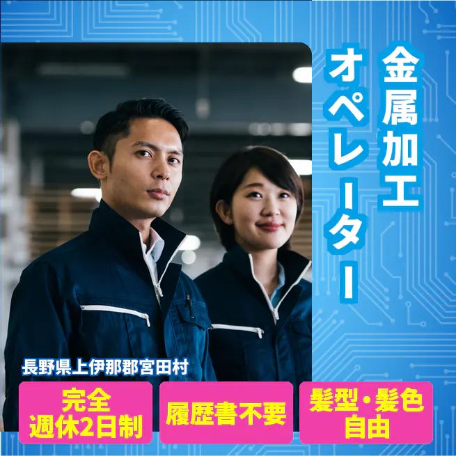 給与詳細 月収例 234,000円 時給例 1,200円 勤務地 長野県上伊那郡宮田村 仕事内容 【業務内容】金属製品の機械オペレーターとして、端末を使用して作業を行います。