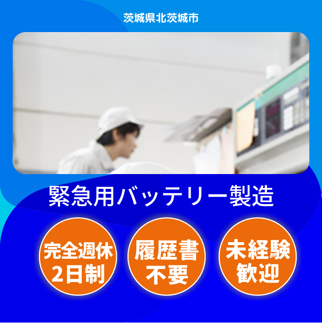 給与詳細 月収例 290,000円 日給例 14,500円 勤務地 茨城県北茨城市 仕事内容 バッテリー製造の鋳造工程、組立、製品機械投入、バリ取り、検査業務