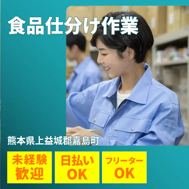 ◆日払い・仮払いOK(アプリでカンタン申請!) 交通費 支給あり 応募の流れ 本ページ内<応募する>ボタンより、必要項目をご入力の上、ご応募ください。 勤務地 【勤務地】熊本県上益城郡嘉島町上仲間 勤務時間 【勤務地】8:00~17:00(休憩60分)