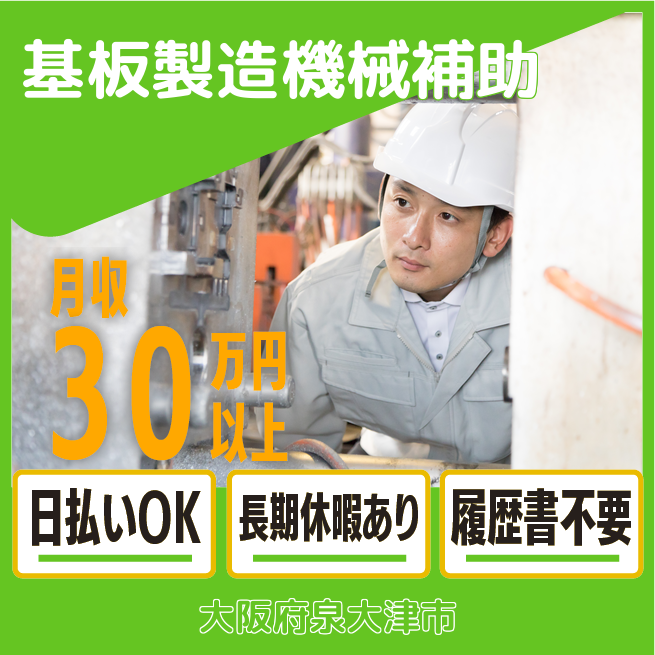 給与詳細 月収例 300,000円 日給例 10,080円 勤務地 大阪府泉大津市 仕事内容 【電子基板を作る機械サポート】