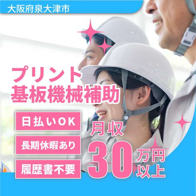 給与詳細 月収例 300,000円 日給例 10,080円 勤務地 大阪府泉大津市 仕事内容 【業務内容】電子基板製造機械のサポート業務
