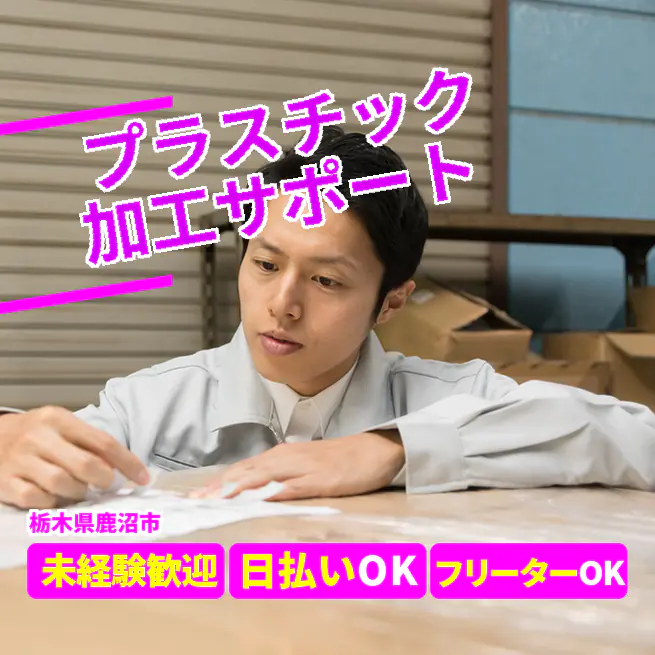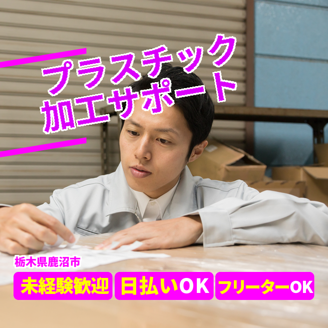 ◆日払い・仮払いOK(アプリでカンタン申請!) 交通費 支給あり 応募の流れ 本ページ内<応募する>ボタンより、必要項目をご入力の上、ご応募ください。 勤務地 【勤務地】栃木県鹿沼市深程 勤務時間 【勤務地】8:30~17:00(休憩60分)