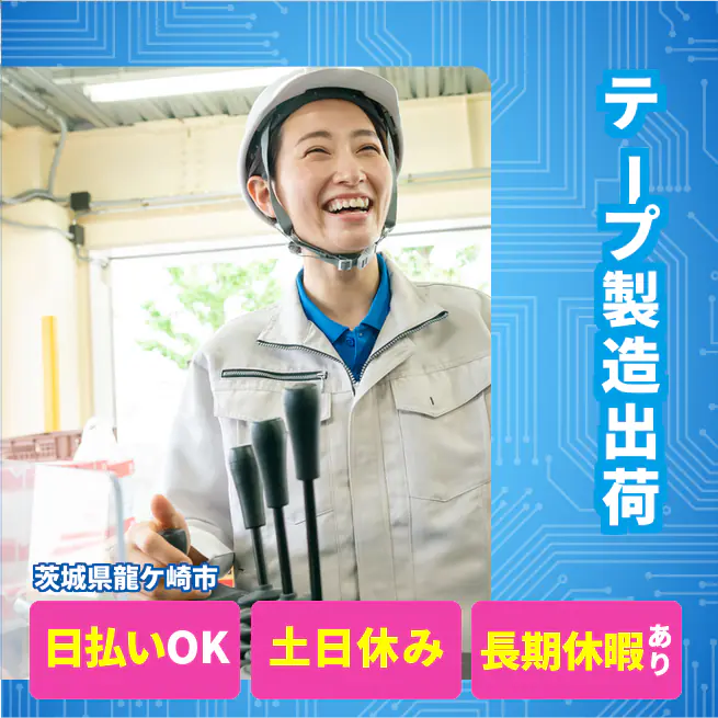 給与詳細 月収例 270,000円 日給例 10,800円 勤務地 茨城県龍ケ崎市 仕事内容 【テープの製造・出荷】