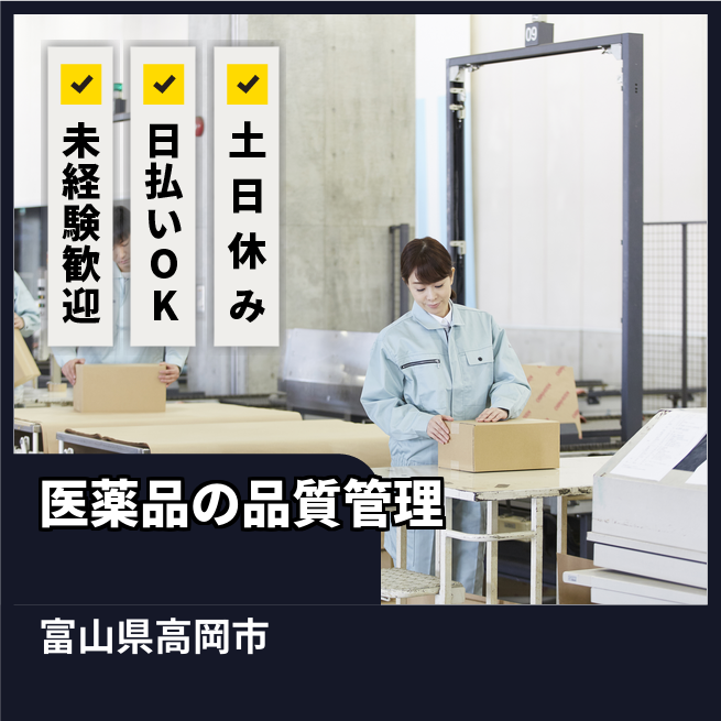 給与詳細 月収例 260,000円 日給例 10,800円 勤務地 富山県高岡市 仕事内容 【医薬品の品質チェック】