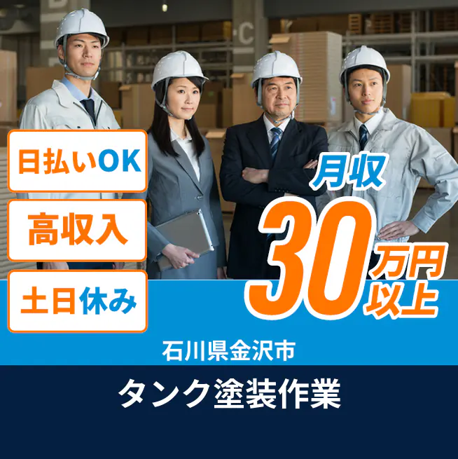 給与詳細 月収例 310,000円 時給例 1,700円 勤務地 石川県金沢市 仕事内容 【タンクの塗装】