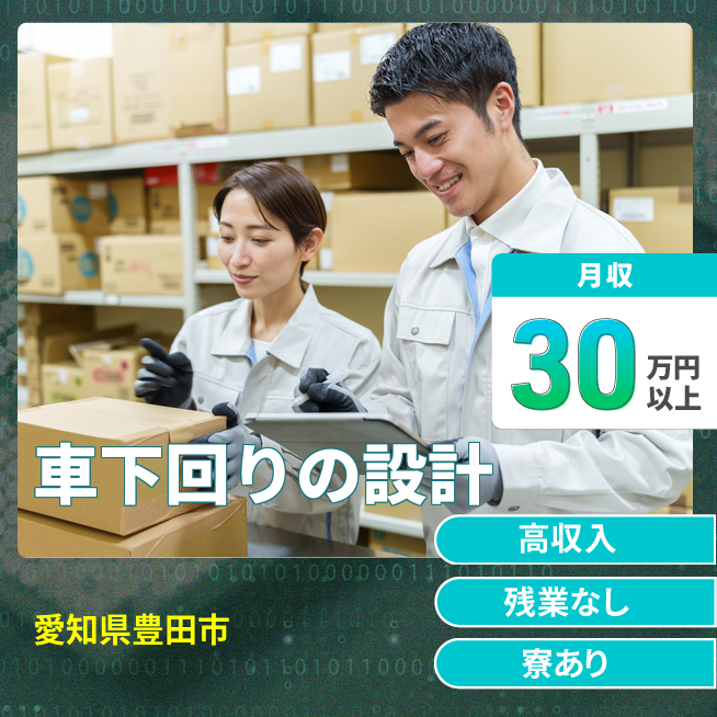 給与詳細 月収例 300,000円 時給例 1,875円 勤務地 愛知県豊田市 仕事内容 【車のアンダーボディ設計】