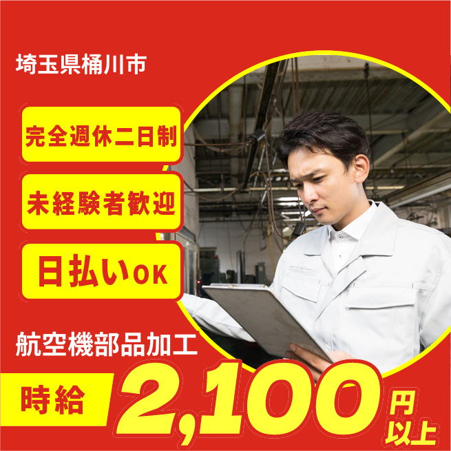 給与詳細 月収例 289,000円 日給例 12,750円 勤務地 埼玉県桶川市 仕事内容 【航空機部品の加工、補助業務】