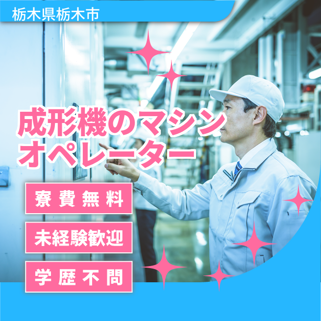給与詳細 月収例 208,000円 日給例 10,400円 勤務地 栃木県栃木市 仕事内容 成形機マシンオペレーター、その他付随業務(立ち作業)。