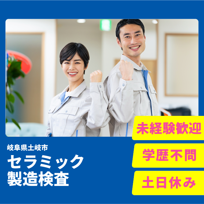 給与詳細 月収例 240,000円 日給例 12,000円 勤務地 岐阜県土岐市 仕事内容 セラミック部品の製造・検査・設備の清掃業務です。【製造】プレス機、ダイシングマシン、レーザー加工機などの各種製造装置のオペレーター。【検査】顕微鏡や各種測定器を用いた精密な品質・外観検査。【清掃】工場内で使用されている製造設備や機器の清掃業務です。セラミック部品を製造するためのプレス機・ダイシングマシン・レーザー加工機などの各種製造装置を清掃します。清掃時に装置部品の簡単な取り外しや取り付けがあります。