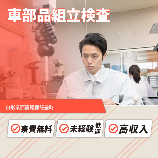 給与詳細 月収例 225,000円 日給例 11,250円 勤務地 山形県西置賜郡飯豊町 仕事内容 自動車の接近感知装置に使われる部品の組立・検査です。組立前の部品を供給や入庫管理、完成品の出荷管理工程もあります。組立・検査後の製品は手のひらに収まるサイズの小型なパーツです。