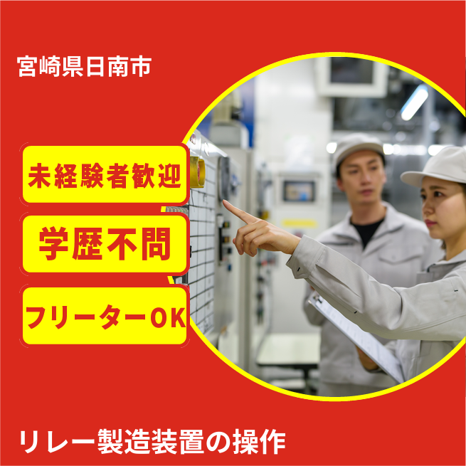 給与詳細 月収例 282,908円 日給例 10,500円 勤務地 宮崎県日南市 仕事内容 車載(自動車用)、通信、民生用などの電気機器に搭載されるリレーを製造するための装置の機械操作などに従事していただきます。