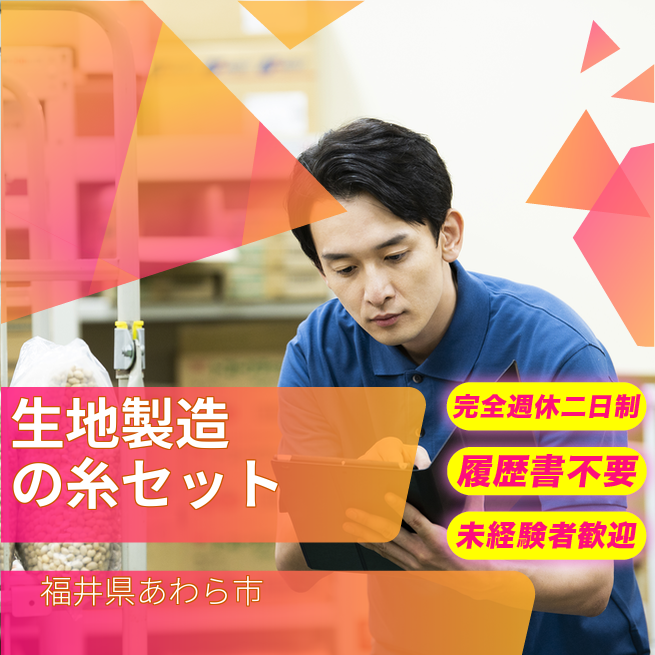 給与詳細 月収例 190,000円 時給例 1,200円 勤務地 福井県あわら市 仕事内容 【業務内容】衣類用生地の製造に関わる機械操作と糸の管理を担当します。