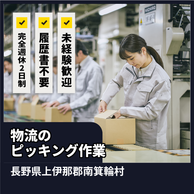 給与詳細 月収例 239,850円 時給例 1,230円 勤務地 長野県上伊那郡南箕輪村 仕事内容 【業務内容】倉庫内での電子部品のピッキングと運搬作業
