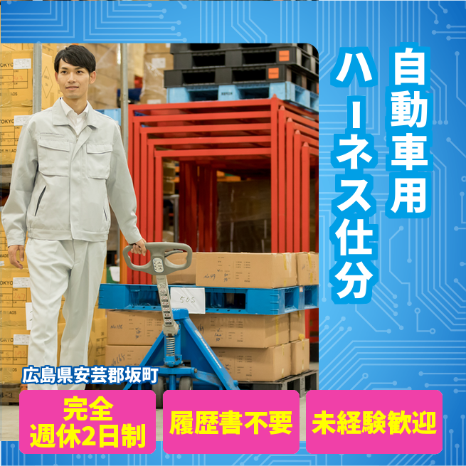 給与詳細 月収例 245,000円 日給例 12,250円 勤務地 広島県安芸郡坂町 仕事内容 【業務内容】自動車用バッテリー接続ハーネスの仕分けと出荷業務