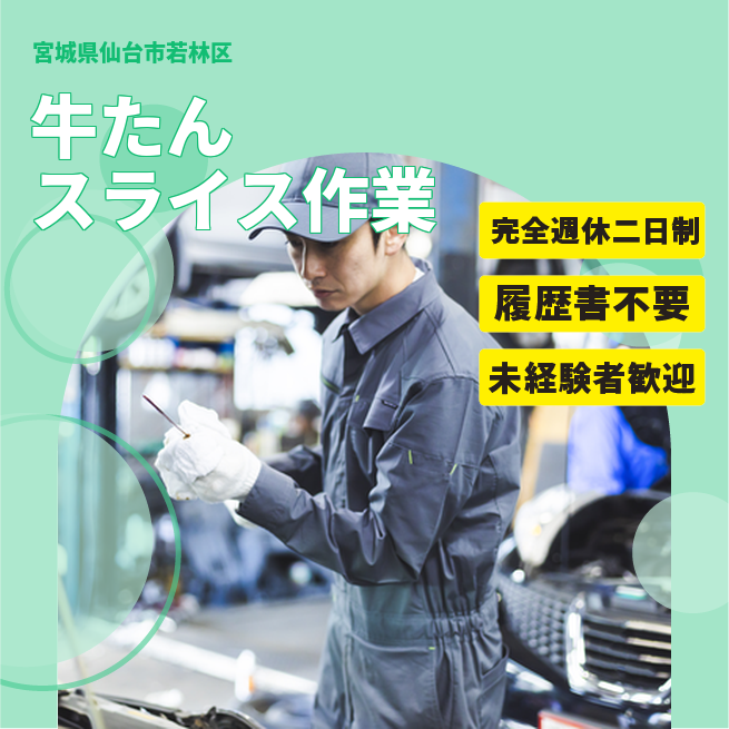 給与詳細 月収例 180,000円 時給例 1,165円 勤務地 宮城県仙台市若林区 仕事内容 【業務内容】牛たんの加工と梱包を行う仕事
