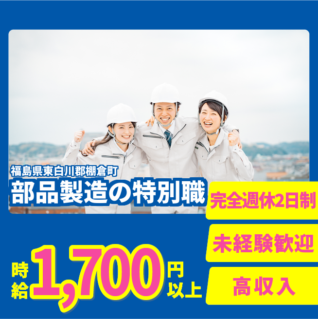 時給例:1700円 交通費 支給あり 応募の流れ 本ページ内<応募する>ボタンより、必要項目をご入力の上、ご応募ください。 勤務地 【勤務地】福島県東白川郡棚倉町- 勤務時間 【勤務地】【3交代】