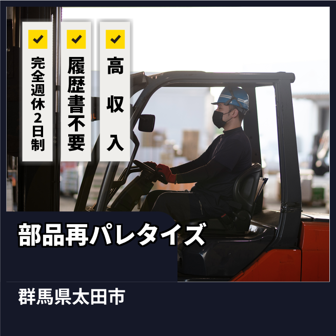 給与詳細 月収例 273,000円 日給例 11,200円 勤務地 群馬県太田市 仕事内容 【業務内容】カウンターフォークを使用して自動車部品の搬送とパレットの再配置を行います。