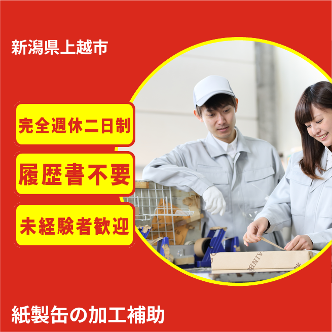 給与詳細 月収例 225,700円 日給例 11,285円 勤務地 新潟県上越市 仕事内容 1つ4㎏程の紙製ドラム缶を機械にセットし、加工が終わったら取り外して積み上げる作業をします。