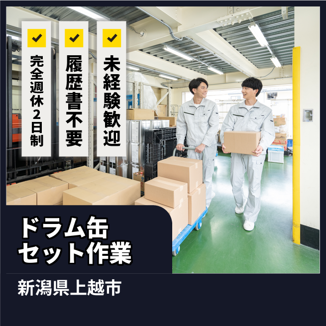 給与詳細 月収例 225,700円 日給例 11,285円 勤務地 新潟県上越市 仕事内容 【業務内容】紙製ドラム缶のセット・加工・積み上げ作業