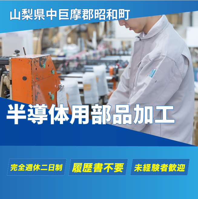 給与詳細 月収例 253,500円 日給例 10,400円 勤務地 山梨県中巨摩郡昭和町 仕事内容 金属部品の加工に伴う機械オペレーション、バリ取り、