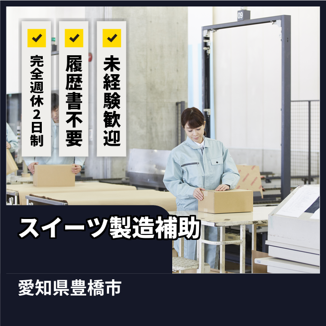 給与詳細 月収例 244,475円 日給例 12,224円 勤務地 愛知県豊橋市 仕事内容 【業務内容】羊羹やゼリーの製造および包装作業