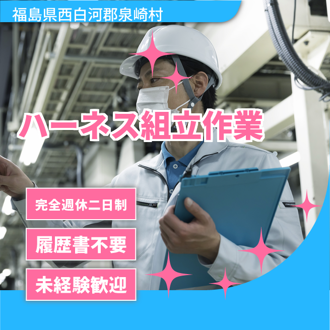 給与詳細 月収例 202,995円 時給例 1,041円 勤務地 福島県西白河郡泉崎村 仕事内容 ハーネスの加工・組立・検査業務を担当していただきます。電線を部品に差し込む作業や、ハーネス製品へのテープ巻き作業が中心です。作業手順は決まっており、未経験の方でも丁寧な指導のもと安心して始められる環境です。そのほか、付随する軽作業をお願いする場合もあります。